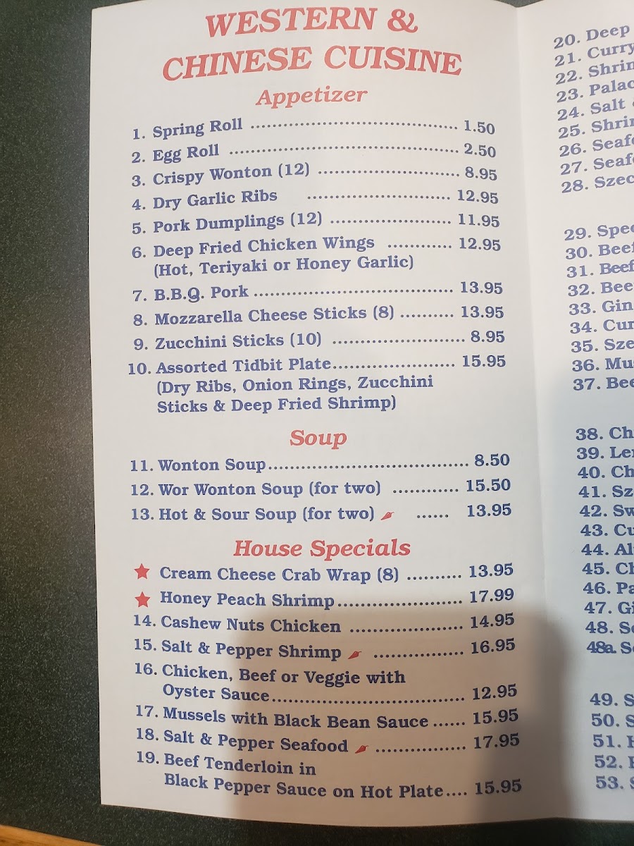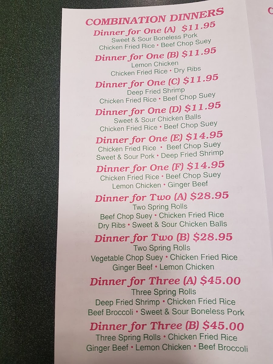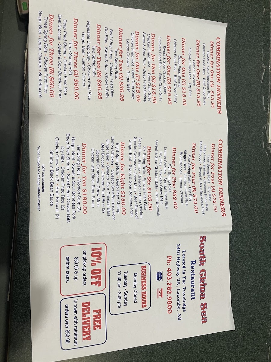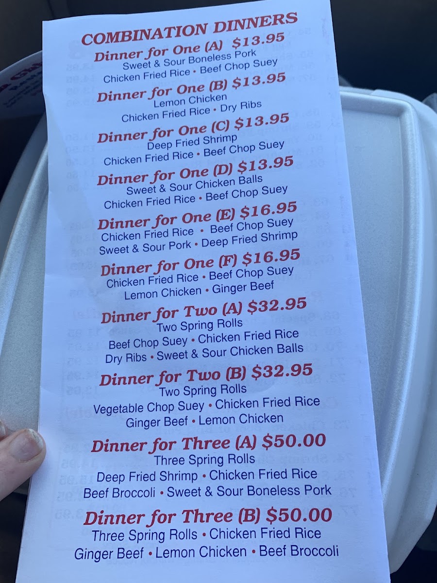 The menu at the Original South China Sea Restaurant offers a wide variety of dishes that showcase the flavors of traditional Chinese cuisine. For appetizers, patrons can enjoy options like Spring Roll, Egg Roll, and Crispy Wonton, perfect for starting the meal. The seafood section features a selection of delectable shrimp dishes such as Deep Fried Shrimp, Curry Shrimp, and Shrimp in Black Bean Sauce, along with the flavorful Palace Style Shrimp and Salt & Pepper Squid with Spices. The Egg Foo Young offerings are diverse, with choices like Chicken, Beef or BBQ Pork, Shrimp Egg Foo Young, Mushroom Egg Foo Young, and the special Special Egg Foo Young. Soups include comforting options like Wonton Soup, Wor Wonton Soup, and the tangy Hot & Sour Soup. For a taste of something different, the House Specials menu features unique dishes like the creamy Cream Cheese Crab Wrap, Honey Peach Shrimp, and the savory Cashew Nuts Chicken. If you’re looking for a hearty meal, the Combination Dinners are an excellent choice, with sets like Dinner for Two, Dinner for Three (A), and Dinner for Three (B). Larger groups can indulge in meals such as the Dinner for Four (A), Dinner for Five, Dinner for Six, or even the Dinner for Eight, which provide an abundance of flavors to share. Whether you're in the mood for seafood, a comforting soup, or a flavorful combination platter, there’s something for everyone on this well-rounded menu.